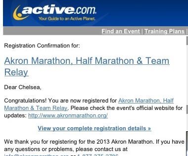 What!  You’re probably wondering what I’m doing signing up for a marathon. You’re probably questioning why and when I signed up for this. Well, I signed up a few weeks ago, but running another marathon has been on my mind for months. When Courtney told me last December she was running Eugene, I was totally marathon jealous. I knew that Eugene wouldn’t be in my schedule for 2013, but I still wanted to find one to run. I thought about Chicago, but I was still on the fence when sign up rolled around. Then a few weeks ago, a friend told me she was interested in running her first marathon. At this point, I had two in my mind that I constantly thought about. It was pretty much a nightly ritual that I told Darren I wanted to run another marathon. So when I told my friend I was running Akron, I had finally verbally committed. A few days later I signed up and I’m so excited to be taking another shot at 26.2 miles. I learned a lot in my first marathon, but I’ve got a whole new plan figured out, and I’ll have someone at my side during the race instead of running alone. To top it off, standing under the mile 26 flag a few years ago was what started the whole thing. I’ll be glad to run past that flag instead of standing on the sidelines.